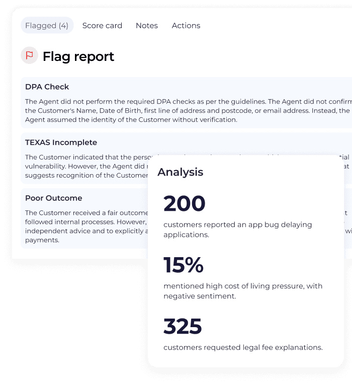 Automatically evaluate 100% of your customer interactions for quality and compliance, flag issues for remediation, and uncover insights to inform your business strategy.