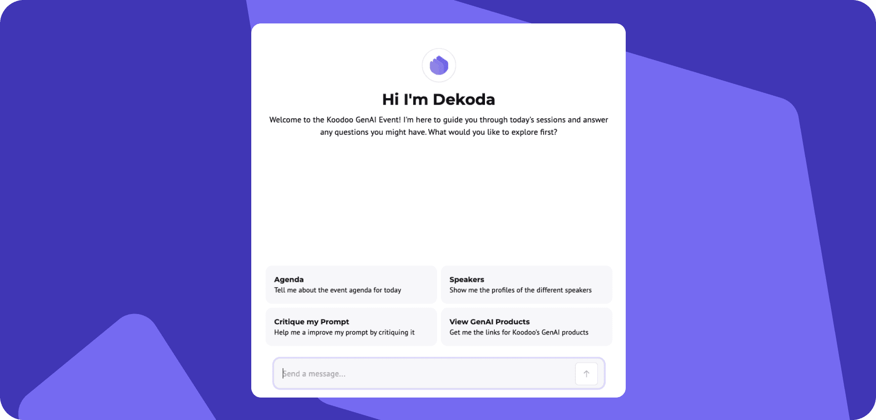 For our recent Koodoo AI Decoded 2:0 event, we custom-built a bespoke chatbot for the event, called Dekoda, to act as a personal assistant to our attendees. Dekoda was the one-stop-shop for all event interactions and enquiries, effectively and seamlessly managing various tasks such as presenting the agenda, distributing materials, assisting with interactive sessions, facilitating polls and Q&A sessions and last but not least, telling guests where the toilets are!