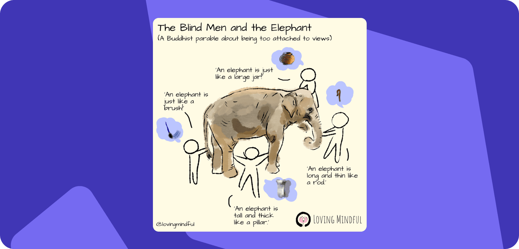 In the well-known fable “The Blind Men and the Elephant,” a group of blind men encounters an elephant for the first time. Each man touches a different part of the animal and forms a distinct impression of what the elephant is like based on the part they touched.